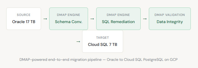 DMAP analyzed all 29 Oracle schemas and their interdependencies, generating a coordinated conversion sequence that respected the complex inter-schema dependency chains. Schema objects — tables, views, indexes, constraints, sequences — were converted automatically to Cloud SQL PostgreSQL-compatible equivalents.